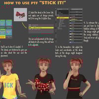 Stick It! will make any clothing item stand out, adding another layer of meaning to your render. There are 4 categories, each including 10 unique designs to choose from (plus variations for certain decals). There are super realistic embroidery, sequins, glitter, and print decals. Our sequins and glitter particles are at slightly different angles which makes them reflect the light in a more life-like manner. Our embroidery shows threads, and our prints show the texture of the fabric underneath with an option to make them look like heat transfers. Prints also have new and aged look versions.