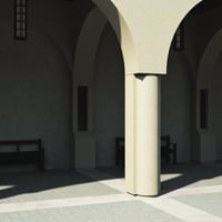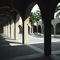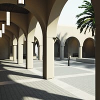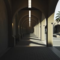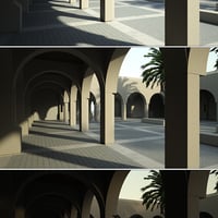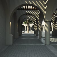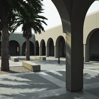Puutarha is a serene sun-drenched courtyard with a covered walkway featuring arched columns, soft lighting, and palm trees.