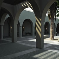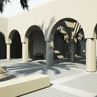 The architectural style evokes a sense of modernism with a subtle nod towards traditional Mediterranean or Middle Eastern influences.