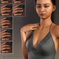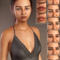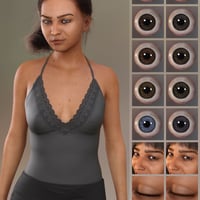 Her face and body morphs were sculpted in Zbrush. Chooli's materials include ten realistic eye colors, seven nail polish colors and options for adding metallic veins over the base nail colors, six eyeshadows, and three lipstick options.