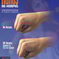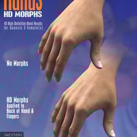 Add some much need realism to your hand poses with these high definition morphs for Genesis 3 Female(s). There are 40 morphs included which have been split into individual fingers both left and right for more versatility. It is possible to add knuckle creases, bend creases for under each finger and also for the top and lower part of the wrist. HD morphs have been made with Sub-Division level set at 3.