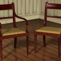 A set of dining furniture from the early 1800s designed to match the townhouse dining room. The sabre legged dining table extends partially to take an extra leaf, or fully to take an extra leg and two leaves. It will comfortably seat eight when fully extended or for an intimate supper for two it can be used closed.
