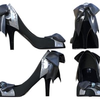 Women's high heels with ribbons and a legging that can be converted to leggings, thigh-highs or stockings, via the included material presets.