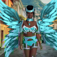 Introducing "Rio Revelry Outfit"! Dive into the spirit of carnival with this vibrant costume that exudes celebration and joy. Complete with majestic wings, shoes adorned with shimmering pearls, and an ornate bra, this outfit is a dazzling tribute to the festive energy of Rio.