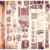 Inside the cyberpunk design package are futuristic symbols,interface icons,Japanese lettering and writings,