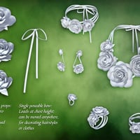 The set also includes three different single rose props and a poseable bow. These items can be positioned anywhere in your scene, to decorate clothing, hair or furniture.