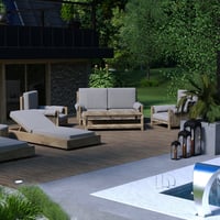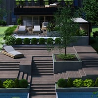 This Scandinavian Style A-Frame House is a complete environment that features lots of details such as trees, grass, sunbeds, terrace decoration a big pool area, and all this next to a lake.