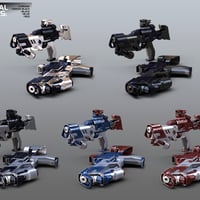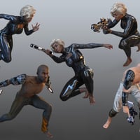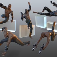 There are 21 Wearable Pose Presets and 20 Pose Presets for each generation and gender. It comes with 1 Sci-Fi Gun and a Laser Beam. The Sci-Fi Gun comes with 8 unique material presets and the Laser Beam comes with 3. In addition this set comes with “Fit to” hand grip pose Presets for over 20 Figures. All material presets are made for the Iray render engine.