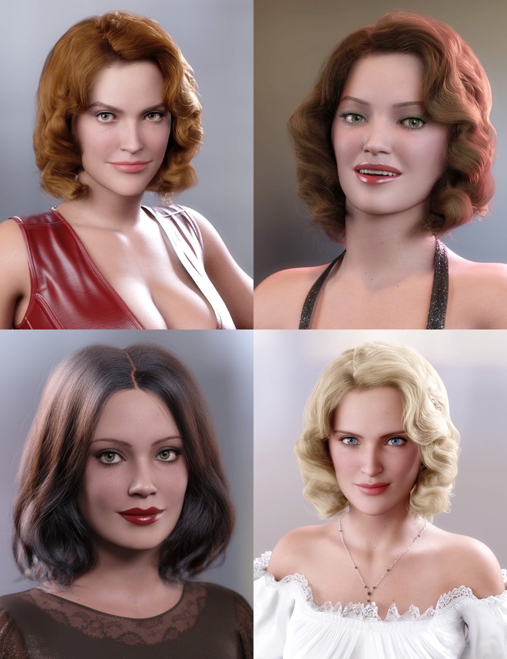 Screen Legends is a set of 20 face morphs inspired by classic screen beauties of the 40s, 50s, and 60s. Each face is individually created to be distinctive and attractive, adding timeless beauty to your renders and stories.