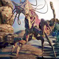 A highly detailed concept for an aquatic or amphibious insectoid, dragonesque mount with bonus head tentacles and saddlery, as well as creature poses and rider poses for Genesis 8 Male and Genesis 8 Female figures.