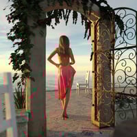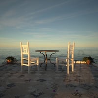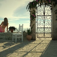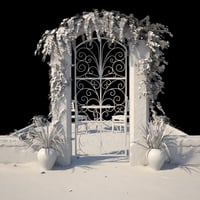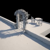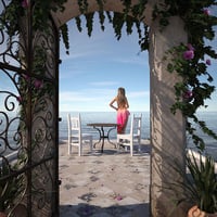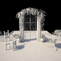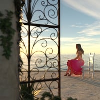 Seaside Gate and Patio features a gate, patio, table, chair, and plants with ocean views in all directions. Three high-resolution HDRIs provide lighting at different times of day (sunset, midday, and afternoon).