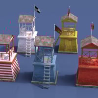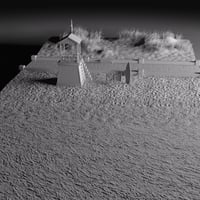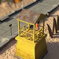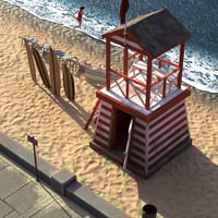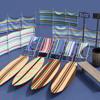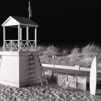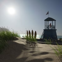 This environment includes a typical wooden surf/lifeguard hut, morphing back dunes, Marram grass, bench, walkway, sloping beach, ocean, signpost, trash bin, deck chair with wind morphs, windbreak with wind morphs and surfboard. There is a morphing flag attached the surf hut flag pole.