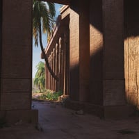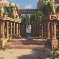 These columns, forgotten for centuries, carved from stone, still hide the secrets of their mysterious past. The vegetation that surrounds this place adds color to the sandy landscape.