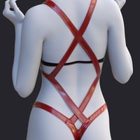A stylish strappy teddy suit with delicate straps that create an edgy look, paired with a matching lace bra.