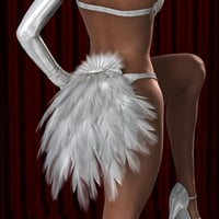 Six separate clothing figures: dress, bra, panties, gloves, bracelets, and shoes; plus two smart parented props: feathered headband, and feathered bustle.