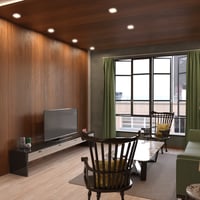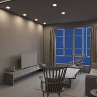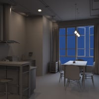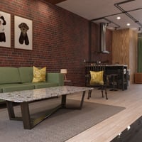 The cozy living room includes elegant furniture, while the sleek kitchen incorporates a contemporary bar counter, making it perfect for urban and loft-style renders.