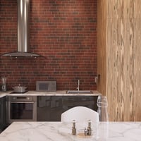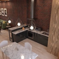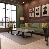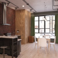 Featuring an open-plan living and dining area, this space is designed with exposed brick walls, wooden accents, and large industrial-style windows that invite natural light.