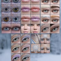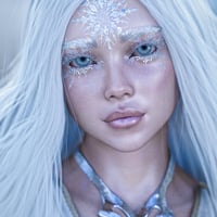 Skadi for Genesis 8.1 Female was sculpted in Zbrush and painted in Photoshop. She comes with a full set of makeup, lips, eyes, nails, two sets of lashes, four different eyeliners and fiberbrows. Two skin texture setups. One with a sprinkling of frost and one without. She also comes with an eye frost LIE and a forehead snow crystal LIE with accompanying metallic geoshells for maximum impact. A light cover of body snow LIE is also included.