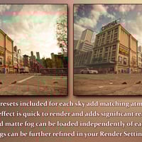 New to this set are customized Matte Fog settings made to match each of the included sky presets. The Matte Fog is a feature released in newer versions of Daz Studio that allows for some quick rendering atmosphere and fog effects. These Matte Fog presets are all color and density matched to their corresponding skies to make adding your content to HDRI backgrounds more seamless and effective than ever. Overall look of the Matte Fog effects can be easily adjusted in your Render Settings tab.
