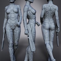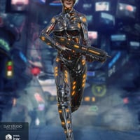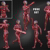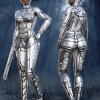 It comes with a full body suit, gloves, helmet, and Pulse Rifle. There's 12 Hierarchical Material Presets in worn metal paint and car paint. It should fit all shapes and future shapes. The helmet glass can be raised or hidden. The Pulse Rifle comes with Hierarchical pose for Genesis 8 Female.