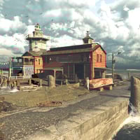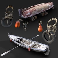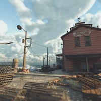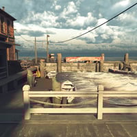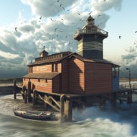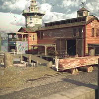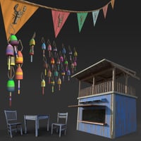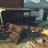 On the docks, a jumble of fishing-related items is piled up: lobster traps, fishing nets, ropes, crates... Small boats are moored to the dock's pilings, waiting for the fishermen to return.