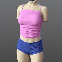 Hot pants and tank tops can be made from various materials, with a total of 14 colors to choose from.
