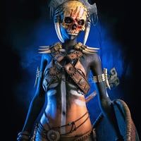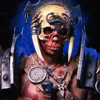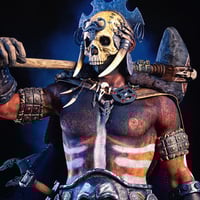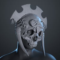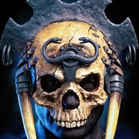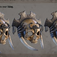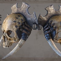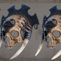 Crafted from bleached bone and bound in weathered iron, the Deathmask bristles with twin tusks and a coiled-serpent crest that threatens your foes long before you even draw breath.