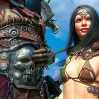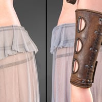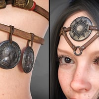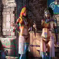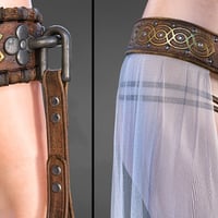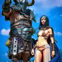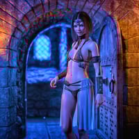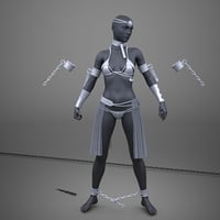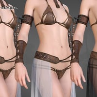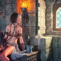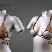 The top is adorned with iron coins, each a token of forgotten tales, while the gold-ornamented shackles and heavy chains suggest you're more valuable than any treasure hoarded by barbarian kings. The translucent fabric draping from the belt ? ...Let's just say it offers as much protection as you'd expect.