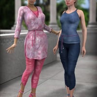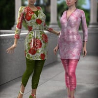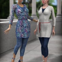 The tunic features morphs for tight and loose style as well as loose style with a belt. There are special morphs to loosen the fabric under the breasts. The danglies at the legs of the leggins are poseable. The belt is fully poseable and features easy-pose movement controls.