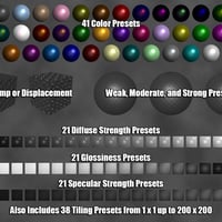 This Super Bundle includes the first five volumes of Super Shaders: Armor & Fabric, Great Grids, Mesh Magic, Scales & Ridges, and Sci-Fi & Tech. That means for one low price you get all 234 unique texture shaders along with 41 color presets, 21 diffuse strength presets, 21 glossiness presets, 21 specular strength presets. It also includes 38 tiling presets (from 1 x 1 all the way up to 200 x 200), 2 presets to control the specular response on transparent objects, presets to use the textures as either bump maps or displacement maps, and three height presets to control the amount of the bump or displacement maps. You can create literally millions of different combinations.