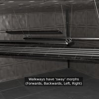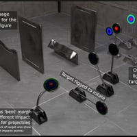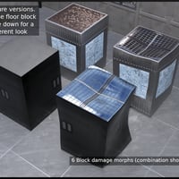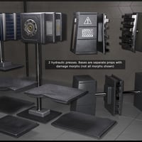 The Superhero Training Room comes with numerous props and figures to be arranged as you like, making this set modular. Two preloads are included for full rooms as examples in 2 different texture flavors, making a total of 4 preloads. Individual items include 2 hydraulic presses — 1 vertical and 1 horizontal (The horizontal one is designed to be used in pairs. Rotate one base 180-degrees in the Z-axis to fit the teeth together.), a rotating hoop to fly through/swing off, a pole to swing from and balance on, a step to step up, a wall to block off a path, a moving target to shoot, a turntable and turrets with a projectile, a floor block to be raised and lowered, and a walkway. The hoop, pole, step, and wall are rigged with a base to appear to extend out from the room's floor/walls (see promos). Numerous movement and damage morphs are also included (see promos).