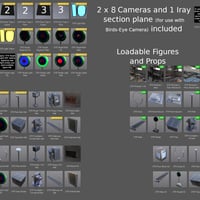 Also included is a set of 8 cameras for use with preload 1 and another 8 for use with preload 2. Depth of Field has been set to get you started, so adjust as needed.Total polycount for a scene with one of each item: 32,723