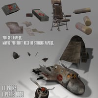 Eleven props center on the remains of a 3D software crash landing. The plane body and insides are two separate parts and can be use independent of one another. The plane's prop, wing part and bits are all individual props, allowing you to adjust for whatever layout you need. Boxes and crates load into place with a captain's seat prop - which could be duplicated for more seating.