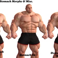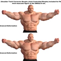 Impossibly muscular figures like SWOLE and the Brute often require many corrective morphs so when you hit certain poses the muscles will look natural. SWOLE 8 Advanced Deformation is a set of corrective morphs for SWOLE 8 Fibo that also includes a set of abdominal flexion morphs and chest morphs that make more natural the flexions and posing of such a muscular figure where the rig deformations will fail to render a natural result.