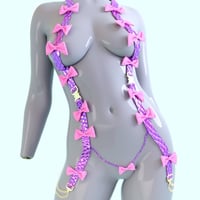 The set includes a special morph for use on male characters with genitals, along with a wide range of material options such as latex, fur, and shiny metallic finishes. You can also choose the No Bows option if you prefer a simple strap-only look.