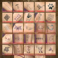 Teensy L.I.E. Tattoos is a huge collection of mini tattoos. It includes traditional shapes, ornaments, hearts, key and lock, birds, dogs, cats, plants, flowers, symbols, quotes and sayings all presented in an artistic flair with a Tattoo Placement Guide.