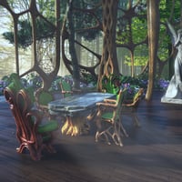 Set contains Organic Membrane roofing and trusses, wooden chairs, long table and vegetations. Forest background is your own preference and not included in the package.