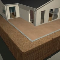 The yard area (18 x 24 meters) is surrounded by a wooden fence with two posable gates at the front entrance and a path leading to the front door. The yard is textured with gravel and stone, and has a tiled patio area at the back of the bungalow. Also included is a fireplace with grate and posable drawer.