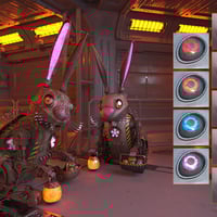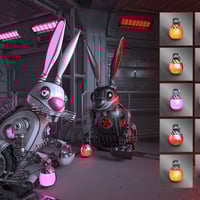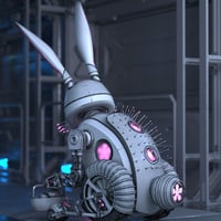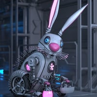 The Robot Bunny clanks through the neon-lit spring meadow, its polished chrome ears swivelling in the breeze. LED eyes glow with a soft pastel shimmer, shifting colors as it scans the landscape. Instead of a fluffy tail, it sports a humming energy core that pulses with each mechanical hop.