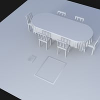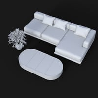 This prop collection includes a cozy couch, a wooden table, a dining table with chairs, a floor rug, a potted plant, and a kitchenette - all nestled within a room with hideable walls for easy camera access.