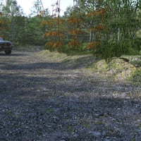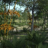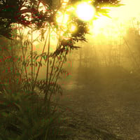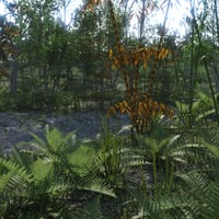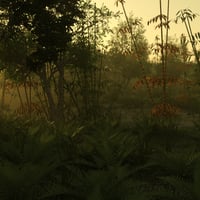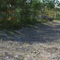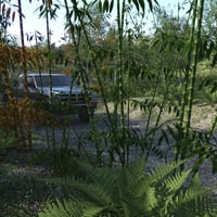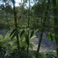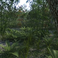 Venture down this dirt road that crosses a beautiful forest with ferns, grass, bamboo, and trees.