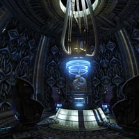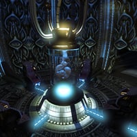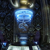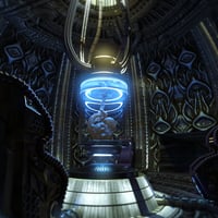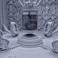 Four seats, crafted from dark, organic material, are positioned around the incubator, their shapes both functional and grotesque, reflecting the cold precision of the Engineer’s creations.