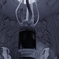 The circular space is enclosed by shifting, vein-like walls, alive with faint, iridescent light. At the center stands a cylindrical incubator, its transparent surface enclosing an alien fetus, suspended in amber fluid.