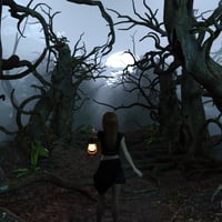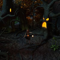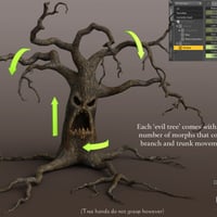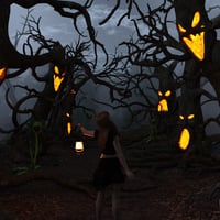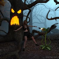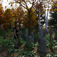 Due to the high number of instances in the cemetery area your computer may lag when every part of the Forbidden Forest is displayed on screen, so to remedy this when you open a scene file it will load with simple looking "low poly trees", simply pose your characters and switch to "Show high poly props" with the drop down menu mentioned above and hit render! Every prop you see in the images can be loaded separately in the center of the screen so you can create your own creepy scenes with the many props and trees provided. You can load an entire summer or autumn scene with a click in either Iray or 3Delight format, the only limitation with the 3Delight version is the 'terrain shader' is Iray only so you can only load one type of material at a time for the ground. Have fun walking through the Forbidden Forest!