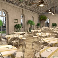 The Orangery Interior includes a number of plants and trees, multi-colored crockery, ceiling fan and light set, scones, table and chairs, and tons of other props + materials.
