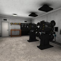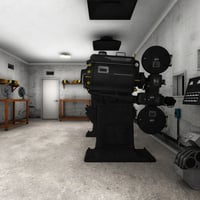 A cinema projection room with detailed carbon arc film projector, film reels and props. An essential collection of unique props to celebrate the art of the cinema projectionist.
