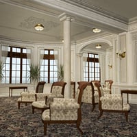 The Reading Room, in contrast to the Smoking Room, was primarily intended for the Ladies. Decorated in the late Georgian style, it features a large bay window looking outwards - coupled with a marble fireplace it created a cozy environment in which to relax, read and converse with the other guests.