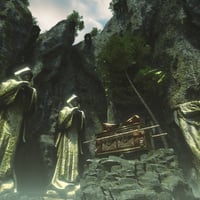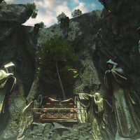 Shrouded in vines and shadows, the statue stands sentinel over the Ark, its serene yet imposing presence hinting at the sacred secrets buried within.