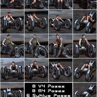 It comes with 28 color variations with Poser MATs and Daz Studio Presets to get the look your going for. Also for maximum use, it comes with over 40 poses for the Syklus, Michael 4, and Victoria 4. There are two 'parked' poses for the Syklus with each pose having two corresponding poses for M4 and V4, all with mirrored versions. Along with the parked poses are 5 'riding' poses for the Syklus, with corresponding M4 and V4 poses and mirrored versions as well, giving everything you need to hit the road with the Syklus!