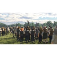 - Generate a medieval market or town square scene with villagers holding pitchforks, torches, and other medieval props. Include background people carrying bags, rolling casks, or interacting in small groups.